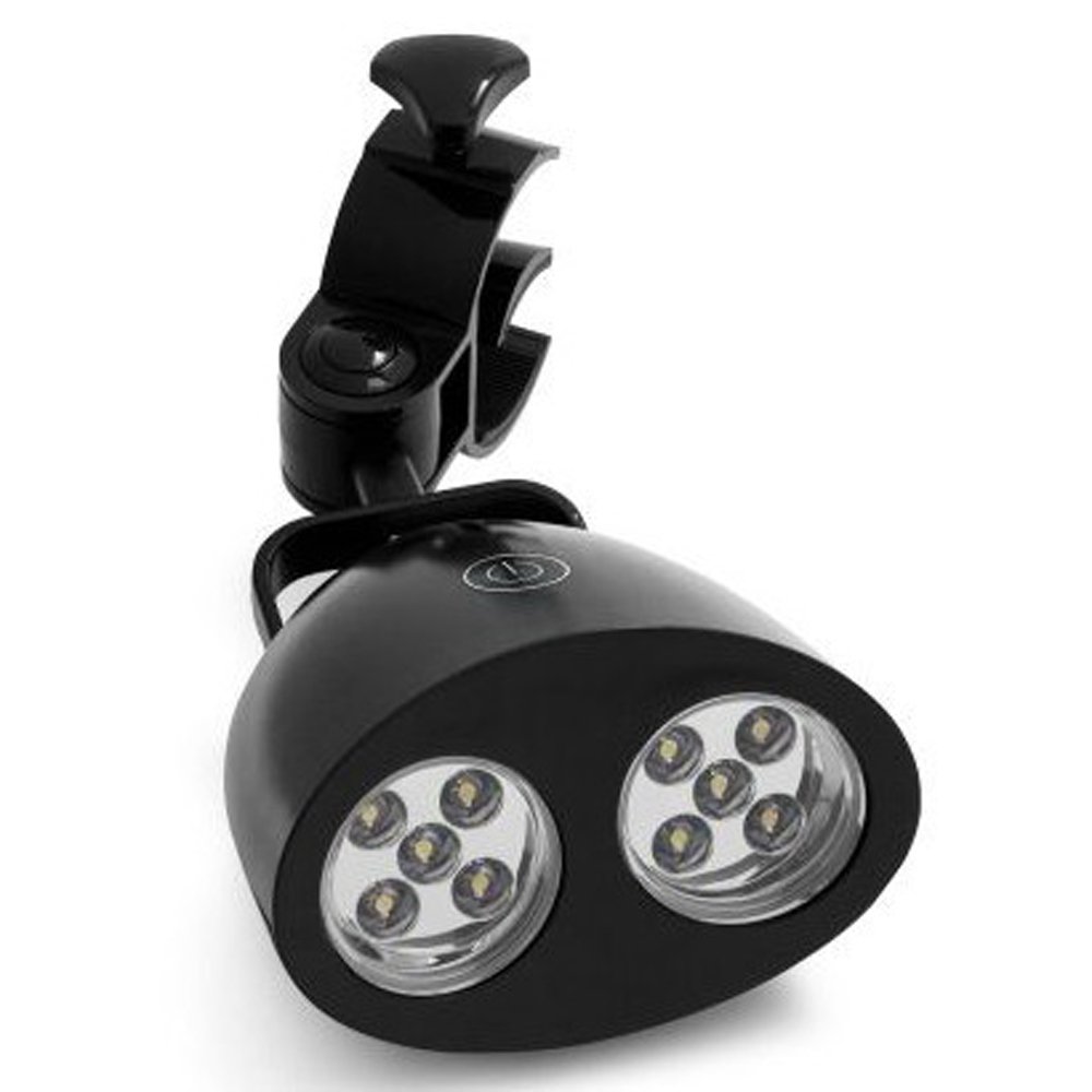 The grill light is so Awesome!! It has a screw clamp feature that works great for the handle of the grill. When it's open the head pivots so he can adjust where the light shines. There are so many great features about this light. The way the light attaches there is no heat obstruction when the lid is closed. The absolute best feature is the on/off. It is sensitive enough to swipe with the back of his hand so he doesn't have to get food or mess on the light.